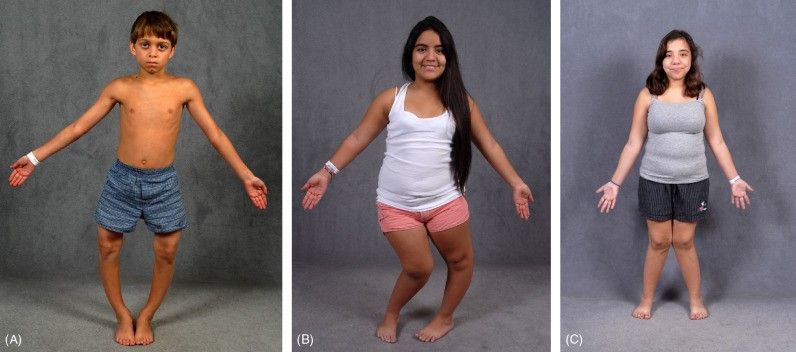 Fëmijët me këtë sëmundje shpesh fillojnë të ecin më vonë se zakonisht. Kockat e tyre janë më të buta dhe deformimet progresive bëhen gjithnjë e më të dukshme gjatë rritjes. Zakonisht vërehet një rritje e vonuar dhe e çekuilibruar: gjymtyrët janë më të shkurtra sesa duhet për moshën dhe gjininë e fëmijës.