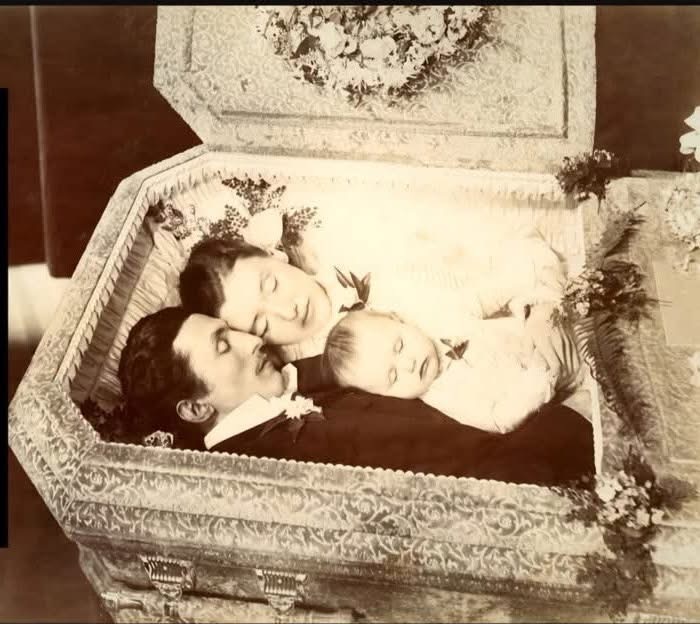 Në galeritë e fotografive post mortem, kjo pamje s’të lejon të kalosh pa u ndalur. Ajo të kap për krahu me një dhembje që s’ka nevojë për fjalë. Një burrë, një grua dhe një foshnje, bashkë në një arkivol, në atë që duket si një gjumë i shenjtë. Por nuk është thjesht gjumë. Dhe as nuk është thjesht një fotografi që dokumenton vdekjen, është një kapitull i mbyllur me dhimbje që s’mund të lexohet pa u tronditur.