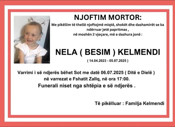 “Me pikëllim té thellë njoftojmë miqtë,shokët dhe dashamirët se ka ndërruar jetë në moshën 2 vjeçare.