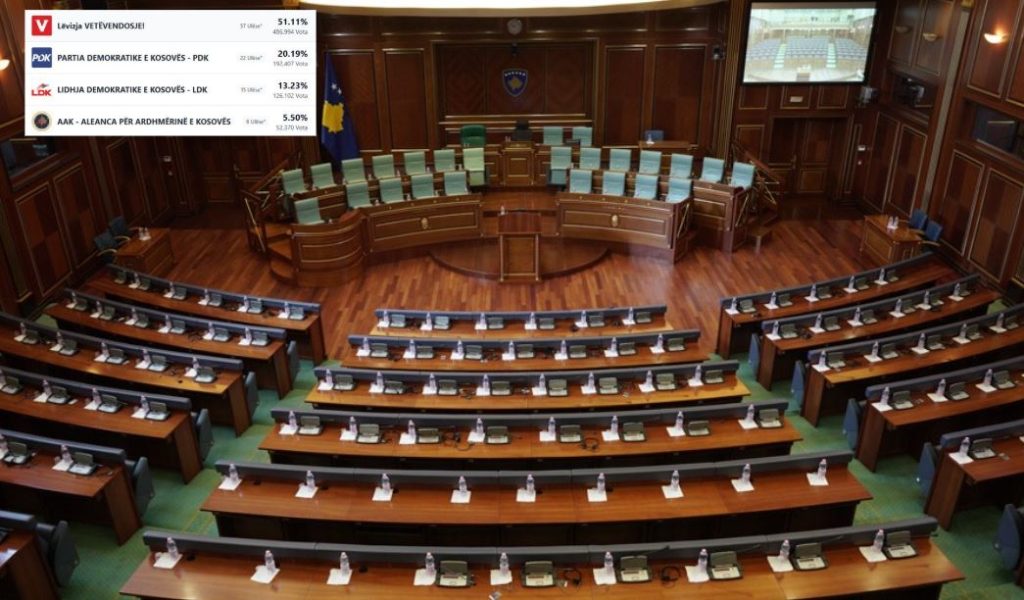 Nga këto rezultate, Lëvizja Vetëvendosje ka siguruar 57 ulëse në Kuvend, Partia Demokratike e Kosovës 22 ulëse, Lidhja Demokratike e Kosovës 15 dhe Aleanca për Ardhmërinë e Kosovës 6 ulëse.