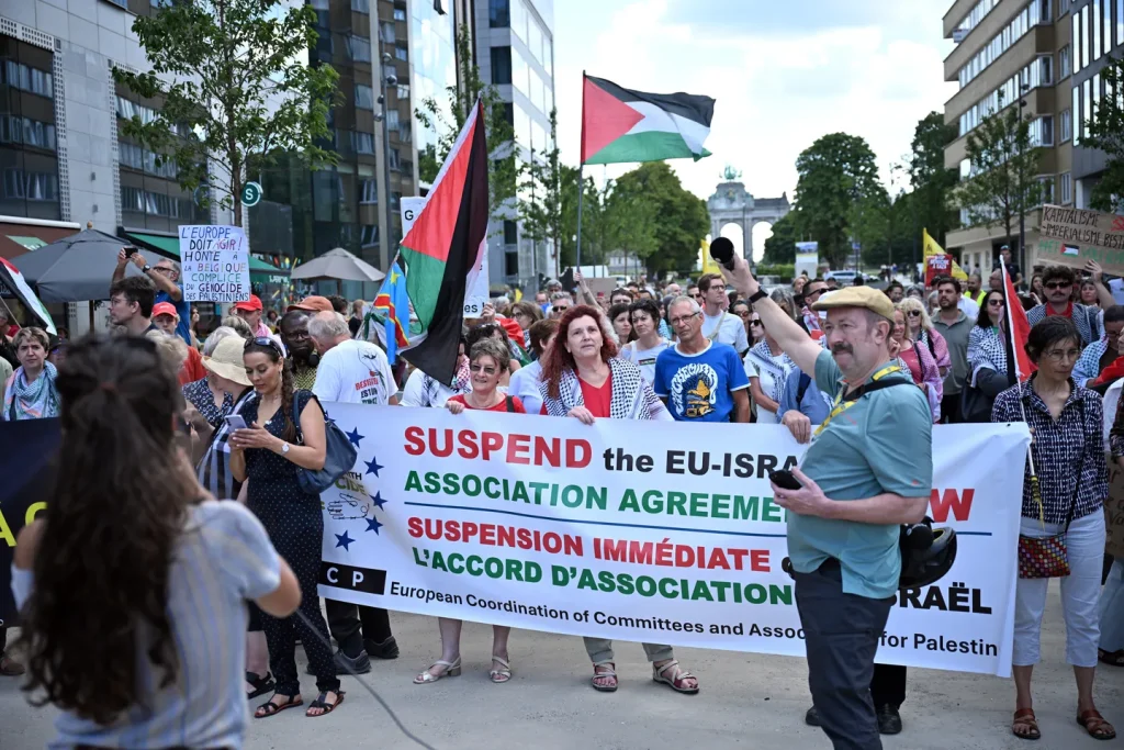 Përpara ndërtesës së Këshillit të Bashkimit Evropian (BE) është mbajtur një demonstratë duke kërkuar pezullimin e menjëhershëm të Marrëveshjes së Asociimit të BE-së me Izraelin dhe ndërprerjen e menjëhershme të të gjitha furnizimeve me armë.