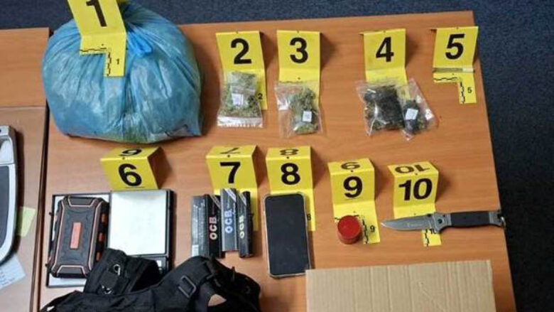 Gjatë kontrollit në shtëpinë dhe pronën e të dyshuarit janë sekuestruar: 1 kilogram e 759.32 gram marihuanë, 1 cigare me substancë narkotike të dyshuar, 2 matës-peshore, 4 paketime rizllash (OCB), 1 bluerës-mulli, 1 mjet i prehtë (thikë), 1 paketë me qese plastike të vogla, 1 jelek antiplumb ngjyrë e zezë dhe 1 telefon celular.