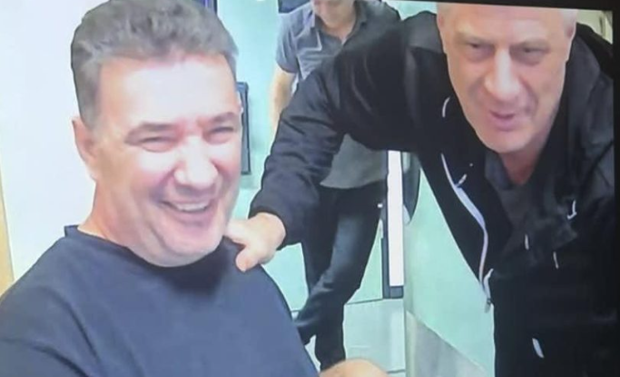 Në këtë fotografi, dukeshin Haxhi Shala dhe Hashim Thaçi duke qëndruar bashkë në Qendrën e Paraburgimit, në një lidhje me video.