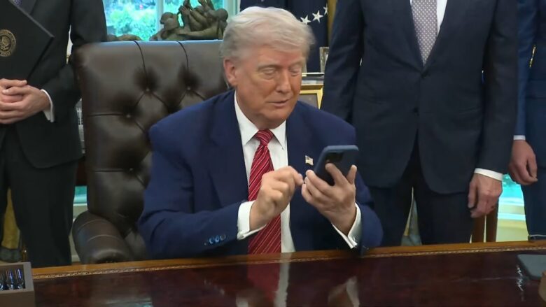 Gjatë një konference për shtyp në Zyrën Ovale të Shtëpisë së Bardhë, e përkushtuar energjisë bërthamore, presidenti amerikan Donald Trump përjetoi një moment të papritur kur telefoni i tij iPhone ra dy herë ndërsa po fliste për tarifat e reja doganore.